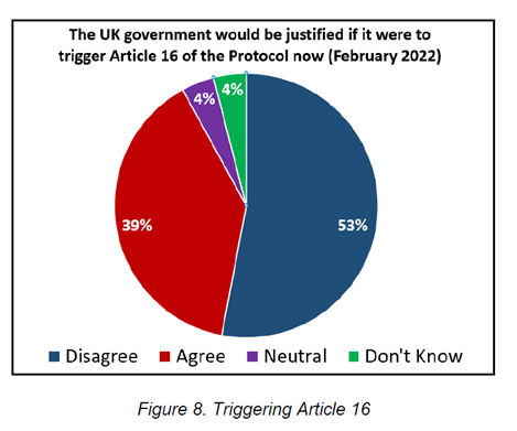 • A majority (53%) of respondents, as in October 2021, disagrees that the UK would be justified in triggering Article 16 now.