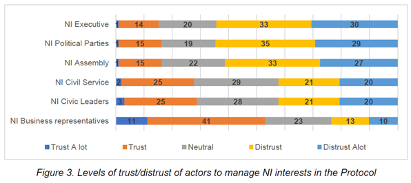 Northern Ireland political parties, the NI Executive, and the NI Assembly fare marginally better, although even they are distrusted by three-fifths of respondents to manage the interests of Northern Ireland in respect of the Protocol. A similar gap between overall trust and distrust exists for the NI civil service (27% v 41%) and NI civic leaders (28% v 41%). In the comments section of the survey, criticism of the DUP is particularly prevalent.