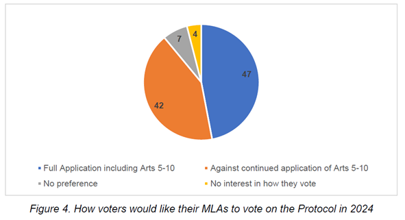 - A very slight majority of voters (47%) want to see their MLAs vote in favour of the continued application of the Protocol in the 2024 ‘democratic consent’ vote compared to those who want their MLAs to vote against (42%).