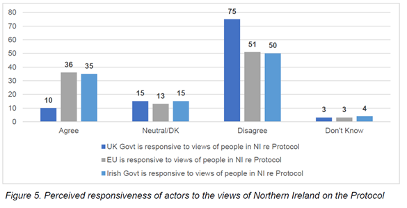 - There are very high levels of distrust of those involved in managing the Protocol in Northern Ireland, most particularly so for the UK government and civil service. The Irish government and the UK-EU Joint Committee also do not have the trust of most NI voters on the Protocol. Relatedly, most believe that these institutions are not responsive to the views of people in Northern Ireland regarding the Protocol.