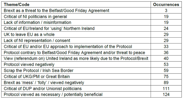 Among the written comments submitted to this survey, characterisations of the Protocol as necessary and/or beneficial occurred most frequently (in fact, twice as often as those criticising it). However, there was variation within this theme. Some respondents believe the Protocol offers “the best of both worlds” and ought to be represented as such. Others believe it could be beneficial if depoliticised and implemented rationally. Another section sees the Protocol as broadly negative but the “least-worst option” which therefore ought to be “made to work”. Many are of the view that Brexit has negative effects: