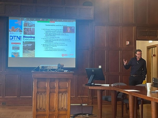 QCAP’s research presentation was organised around the practice of a local social enterprise called East Belfast Mission and their efforts to develop a community-led housing project called Hosford Community Housing (HCH). The aim of HCH is to increase local housing supply and provide transitional housing options for ‘tenancy ready’ individuals that are currently trapped in hostel accommodation, in particular migrants and the working poor. Working with the Hosford team, QCAP academics have utilised a Social Return on Investment (SROI) methodology to forecast the blended types of value that could be returned by East Belfast Mission investing in a new transitional homeless housing model. The applied research has been critical to leveraging wider engagement with a social investor called Commonweal who has provided the Hosford project with a £500,000 loan to spot-purchase 5 residential units across the East Belfast. This investment has brokered an invitation from the Department for Finance for HCH to apply for an additional loan to scale the model in the long term. QCAP academics have provided ongoing support for this process through sectoral research, local housing market analysis and technical assistance to develop a business plan and subsequent loan application.