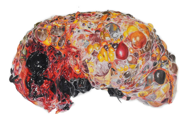 Claire Carswell’s artwork focuses on medical illustration using coloured pencils, with subject-matter centred on disease, injury and surgery. During each illustration she focuses on emphasising colour, texture, light and dark in an attempt to create a finished hyper-realistic visceral image. Her arts practice has helped ground her approach to the research she has been conducting with RAG, enabling her to draw on her own experiences whilst implementing an arts-based intervention for patients receiving haemodialysis.