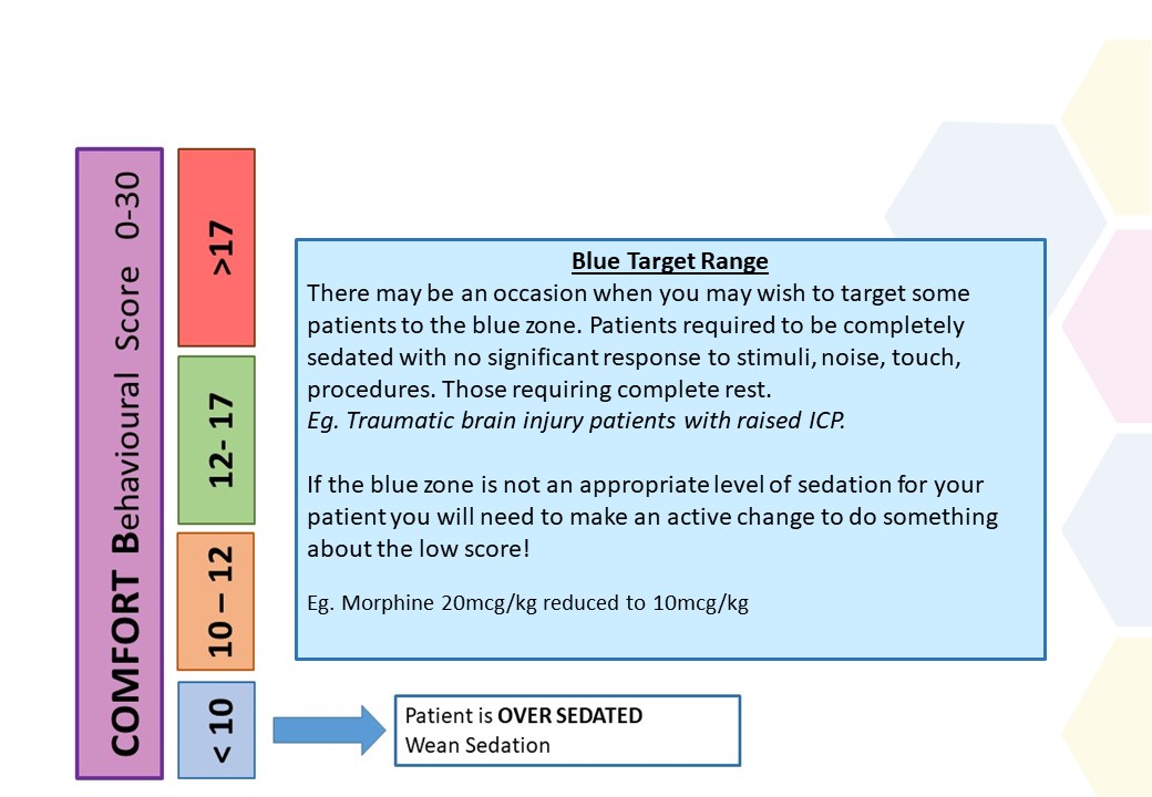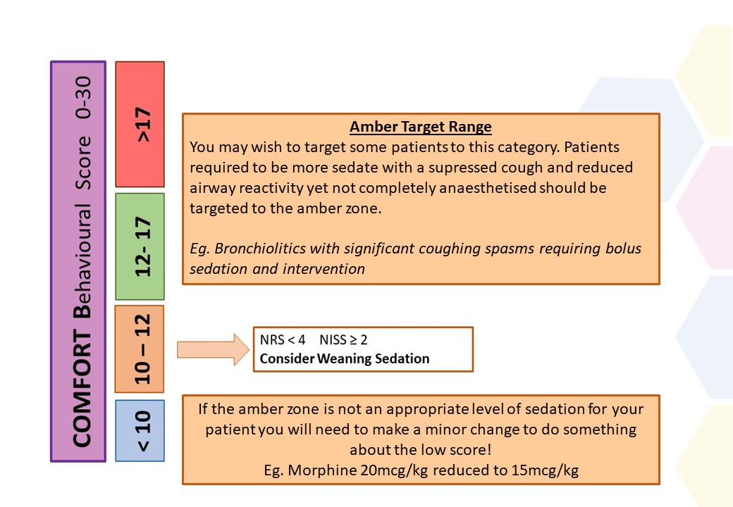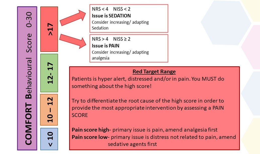 The titration guides are designed to aid clinicians to identify how appropriately sedated a patient is, and if any changes are required to optimise their sedation and/or pain management. We ask the clinician to refer to the guide to identify if the patient is optimally sedated, over sedated or under sedated. If the patient's COMFORT Score is too high the titration guide advocates the clinician assess a pain score to identify if the high score relates to a pain or sedation issue.