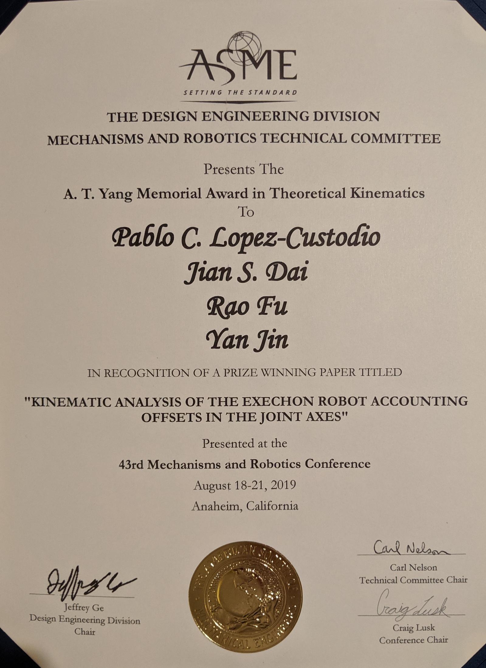 - A. T. Yang Memorial Award in Theoretical Kinematics, the highest and very prestigious award in the world of kinematics. The award is given to us based on our paper titled "Kinematic Analysis of the Exechon Robot Accounting Offsets in the Joint Axes", which was presented in the ASME 2019 International Design Engineering Technical Conferences & Computers and Information in Engineering Conference (IDETC/CIE 2019) on 18-21 August 2019 at Anaheim, CA, USA.
