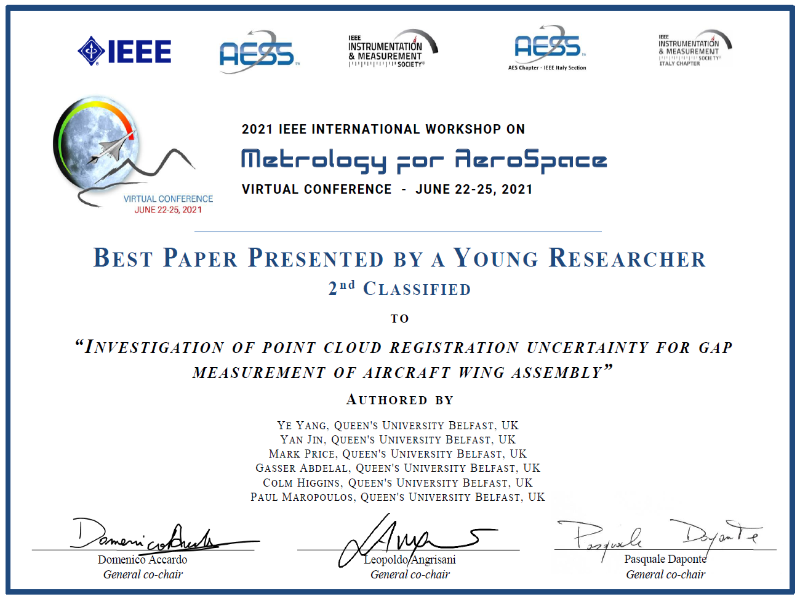 - Best Paper Presented by a Young Researcher, 2nd Classified, 2021 IEEE International Workshop on Metrology for AeroSpace, Virtual Conference, June 22-25, 2021.