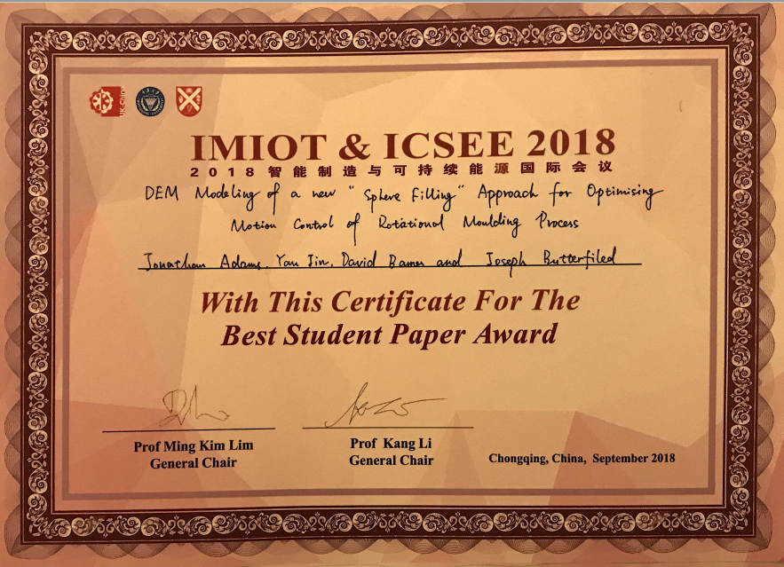 - Best Student Paper Award: IMIOT & ICSEE Conference (International Conference on Intelligent Manufacturing and Internet of Things, Intelligent Computing for Sustainable Energy and Environment) 21-23 Sep 2018, Chongqing China.
