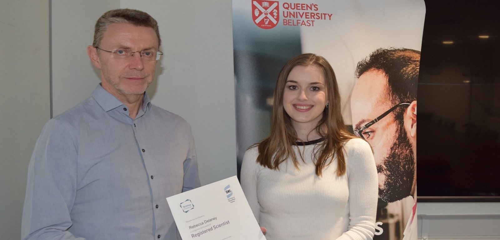 Congratulations to Dr Rebecca Delaney, pictured here with Professor Alan Stitt, receiving her Professional Registration at Registered Scientist (RSci) level certifcate.